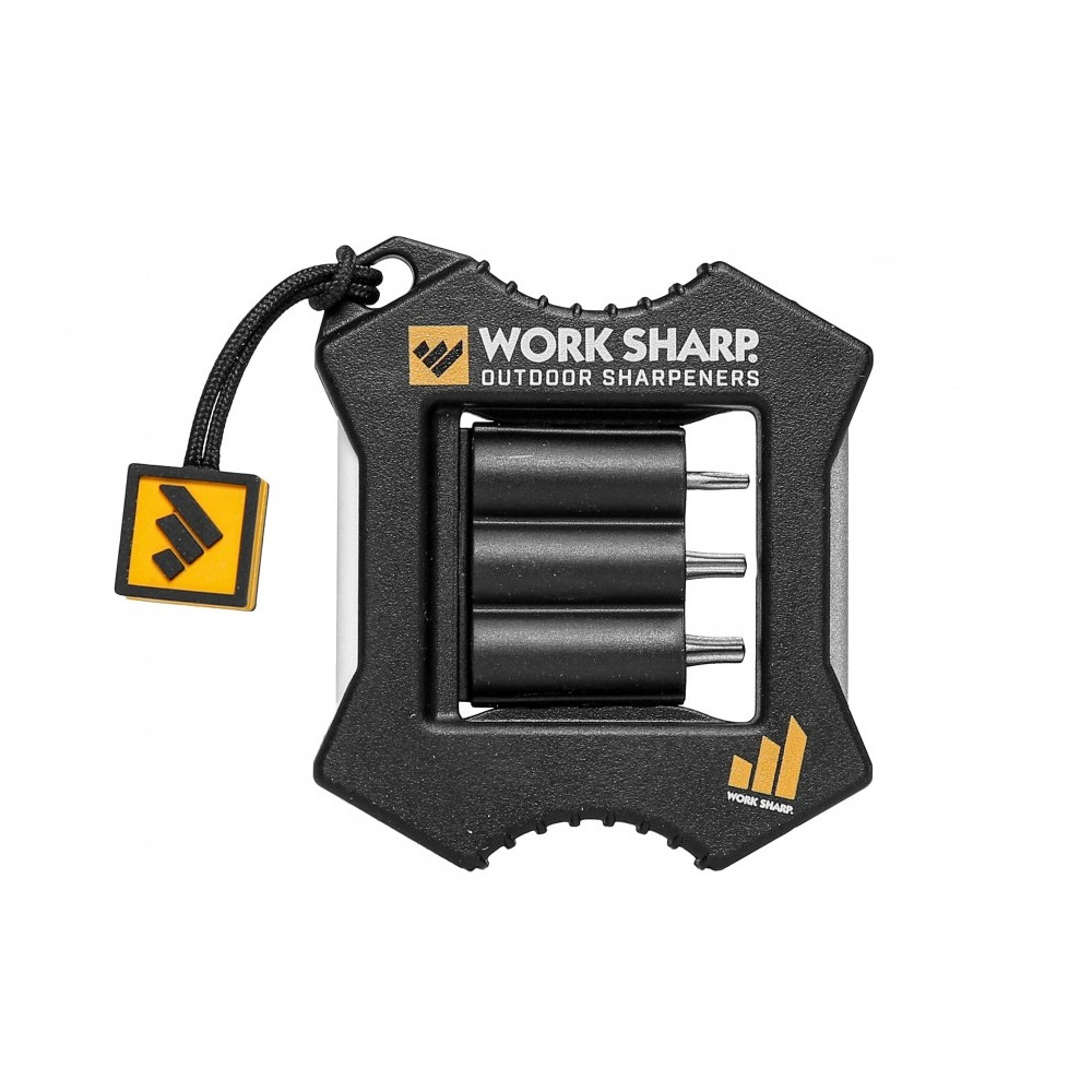 Štítek s logem Work Sharp, připevněný k brousku, umožňuje snadné vyjmutí z kapsy nebo tašky.