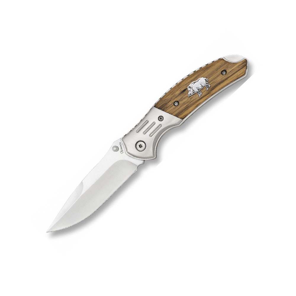Rukojeť nože je vyrobena ze zebrawood (dřevo), které je známo svou odolností a dlouhou životností. Tento materiál dodává noži přirozený vzhled, zároveň zvyšuje jeho komfort a kontrolu při manipulaci. Rukojeť je doplněna o ocelovou ozdobu s motivem kance a má délku 11,20 cm, takže se pohodlně vejde do ruky.