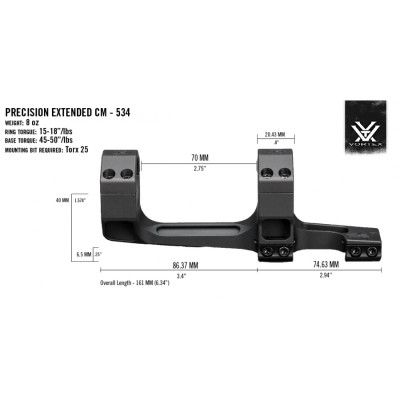 Model Precision Cantilever s kódem CM-534 je konstruován pro moderní puškohledy s 34mm tubusem, které vyžadují extrémně tuhé a stabilní uložení. Na rozdíl od verzí s náklonem je tato montáž v rovině (0 MOA), což je ideální pro střelce, kteří mají u své optiky dostatečný vnitřní rozsah výškové korekce nebo střílejí na vzdálenosti, kde přídavný náklon není potřeba.