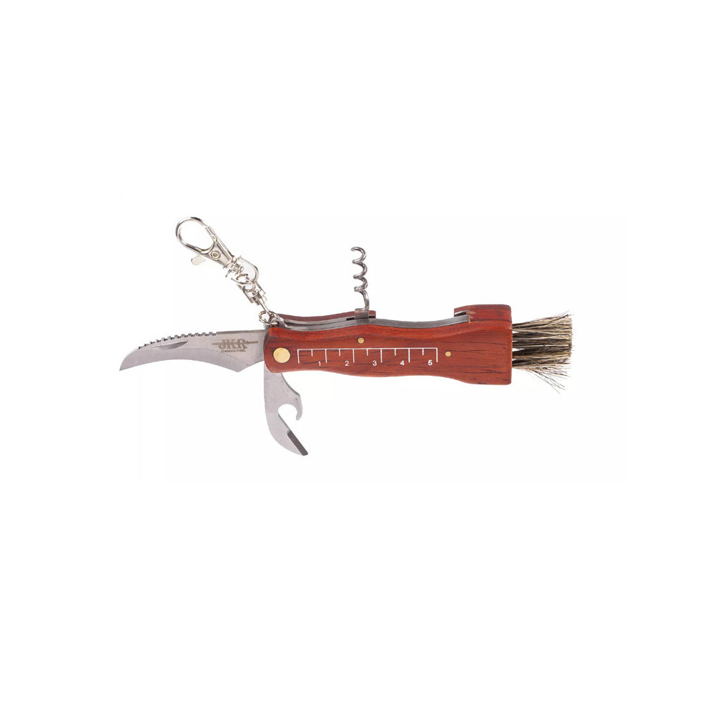 Rukojeť z pevného dřeva nejen skvěle padne do ruky, ale také skrývá řadu praktických prvků. Najdete zde měřítko pro určení průměru houby, vývrtku, otvírák na konzervy a láhve a pinzetu. Nechybí ani kartáček na konci rukojeti pro pečlivé čištění nasbíraných hub přímo v lese.