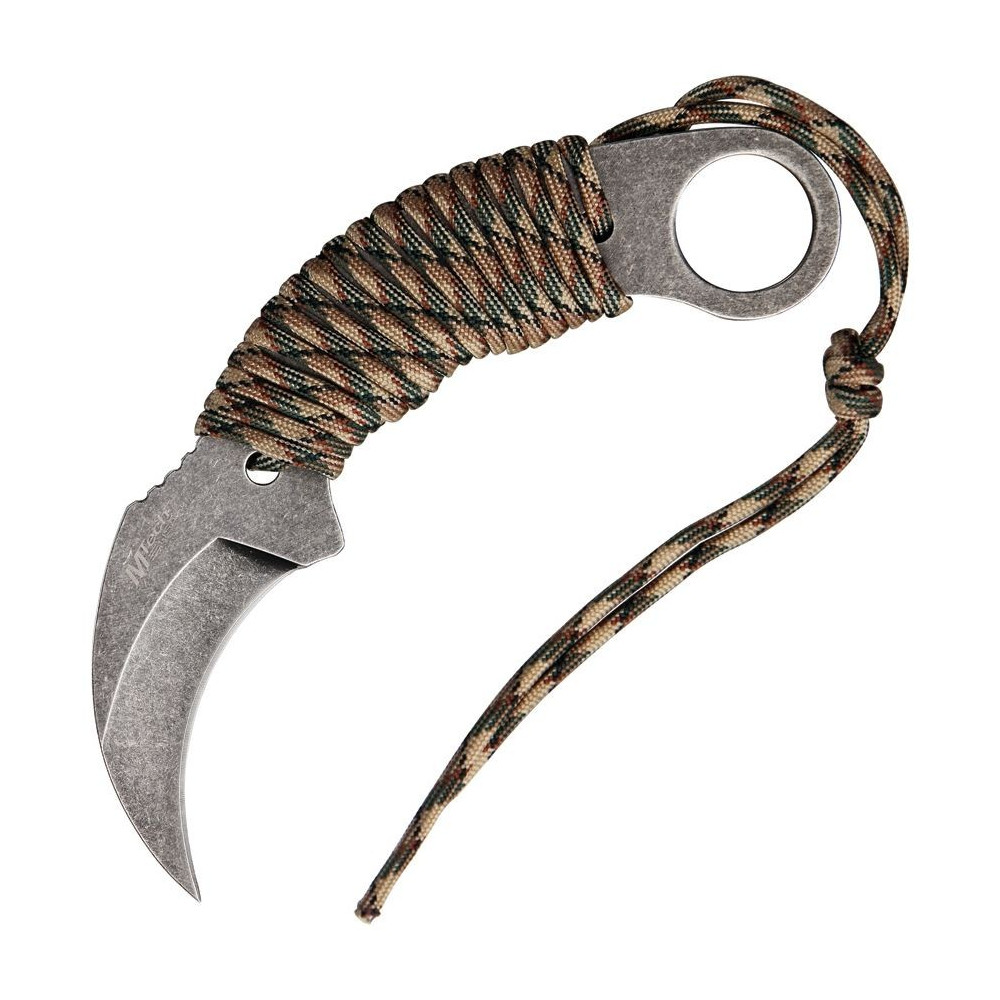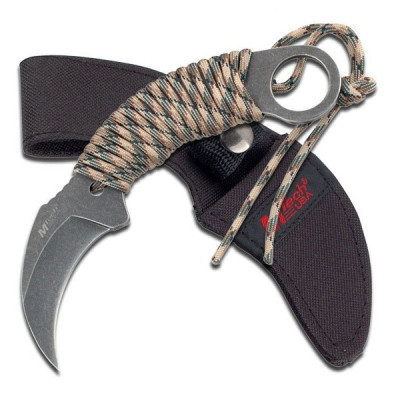 Pevný nůž, karambit značky MTech. Jednodílná konstrukce z nerezové oceli 440 s povrchovou úpravou stonewash, která na noži vytváří patinu (styl vintage). Pro karambity charakteristicky zahnutá čepel má na vrchní straně vroubky, o které můžete při práci opřít palec. Váš úchop tak bude jistější. Rukojeť je omotaná paracordovou (padákovou) šňůrou a zakončena kruhem na prst. K noži je dodáváno černé nylonové pouzdro, které můžete navléknout na opasek.