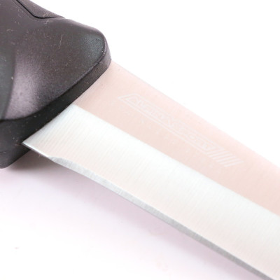 Pevná čepel s hladkým ostřím. Protiskluzové gumové plochy . Polymerové pouzdro.