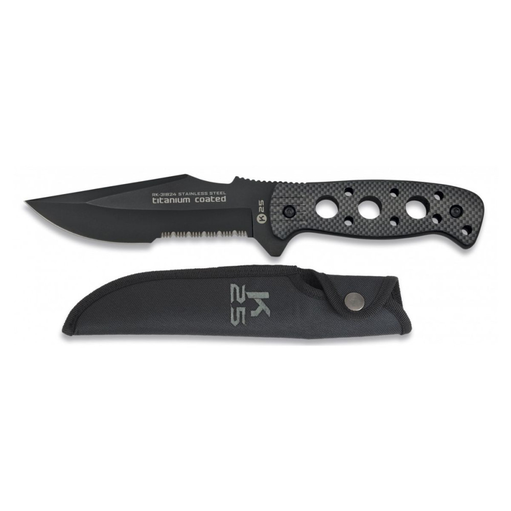 Elegantní integrální nůž K25 je dokonalým spojením vysoké kvality a sofistikovaného designu. Tento pevný nůž je vyroben z nerezové oceli 440, která je známá svou odolností a dlouhou životností. Čepel o délce 13,5 cm je navíc pokryta titanovým povrchem, což zaručuje vysokou odolnost proti opotřebení a korozi.