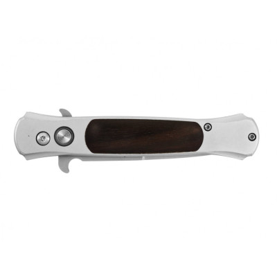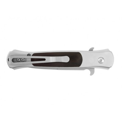 Ergonomická rukojeť z hliníku má vložky z precizně upraveného dřeva. Protiskluzová textura rukojeti zajišťuje bezpečný úchop za všech podmínek. Spona umístěná na rukojeti umožňuje bezpečné a diskrétní přenášení nože. Nůž je dodáván v elegantním balení.