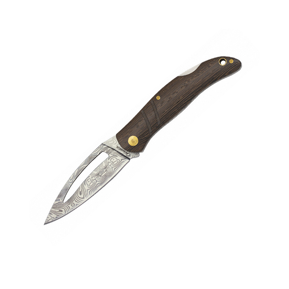 Kapesní zavírací nůž s čepelí s hladkým ostřím. Součástí dřevěné rukojeti je spolehlivá pojistka...