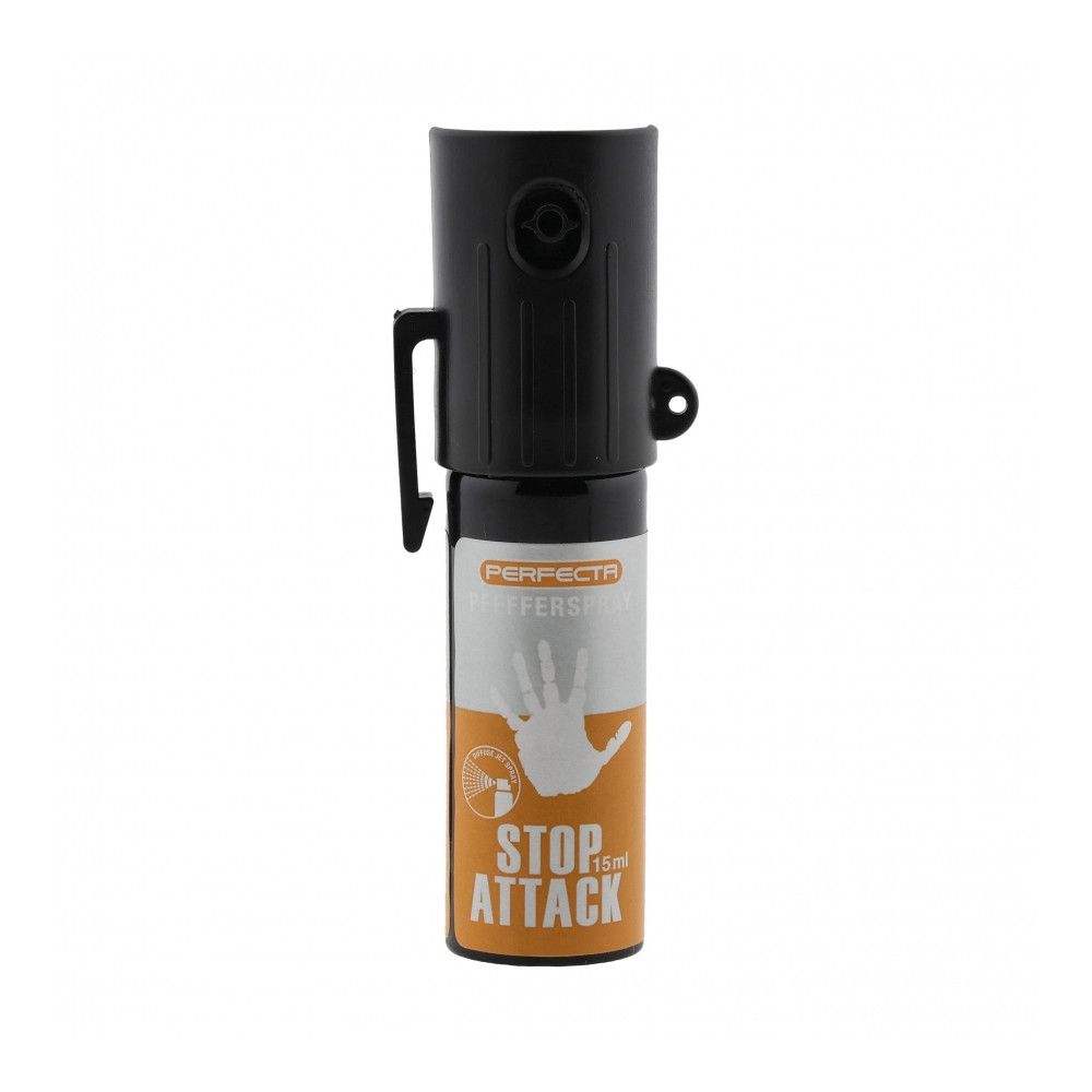 Perfecta Stop Attack 15 ml je kompaktní a účinný obranný pepřový sprej s dosahem až 3 metry. Uvolňuje účinnou látku ve formě širokého kuželového rozptylu, což výrazně zvyšuje šanci na zasažení útočníka. Obsahuje 10% roztok kapsaicinu OC, který po zásahu okamžitě způsobuje silné pálení pokožky, podráždění dýchacích cest a intenzivní slzení očí. Účinek trvá přibližně 30 minut, což poskytuje dostatek času k úniku a přivolání pomoci. Sprej je účinný i proti osobám pod vlivem alkoholu, drog nebo jiných omamných látek. Díky malé velikosti se pohodlně vejde do kapsy nebo kabelky. Praktický klip umožňuje upevnění spreje na opasek.