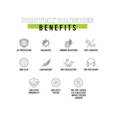 Vortex u brýlí Banshee využil své zkušenosti s povrchovými úpravami optiky. Čočky jsou opatřeny vrstvami, které odpuzují mastnotu a nečistoty, takže se snadno čistí a nezamlžují se tak snadno jako běžná skla. Ergonomie rámu je dotažená k dokonalosti – brýle netlačí ani při dlouhém nošení pod střeleckými sluchátky.