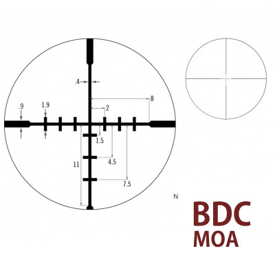 Dead-Hold BDC záměrný kříž (SFP): Speciální kříž s osnovou pro kompenzaci propadu střely. Ideální, pokud střílíš na různé vzdálenosti a nechceš se zdržovat točením věžiček.