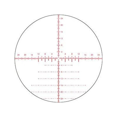 První fokální rovina (FFP) a kříž EBR-7B: Záměrná osnova vyleptaná do skla se zvětšuje spolu s obrazem. Kříž EBR-7B MOA je navržen tak, aby umožnil extrémně přesné odečty vzdálenosti a přenášení záměrného bodu i při maximálním 24násobném zvětšení.