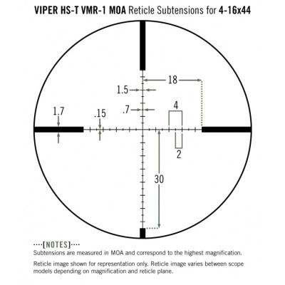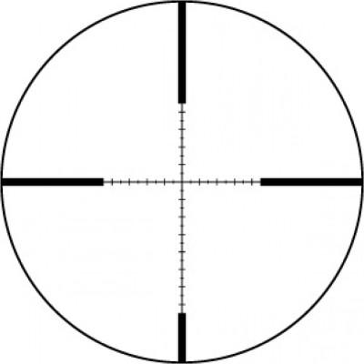 Záměrný kříž VMR-1 MOA (SFP): Moderní osnova s pomocnými značkami pro kompenzaci propadu a větru. Kříž je ve druhé fokální rovině, takže zůstává stejně jemný i při velkém zoomu.